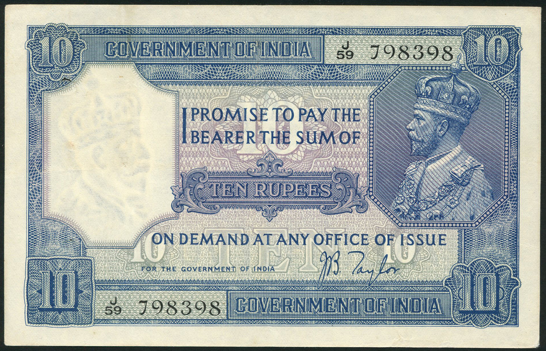 Government of India, 10 rupees, ND (1925), serial number J/59 798398, blue, lilac and white, George V at right, Taylor signature low right, value at centre and at each corner, reverse blue, value and Royal cypher