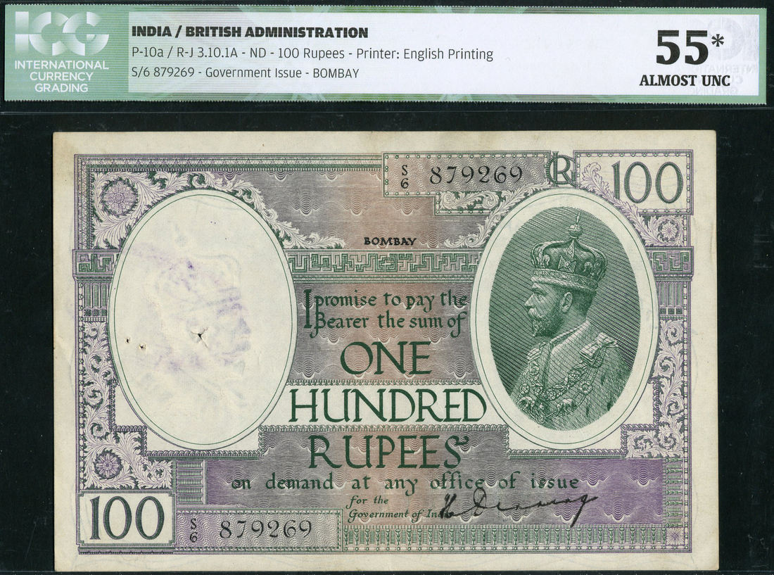Government of India, 100 rupees, Bombay, ND (1917-30), serial number S6 879269, violet and green, George V in oval frame at right, value at centre and at low left and top right, Denning signature