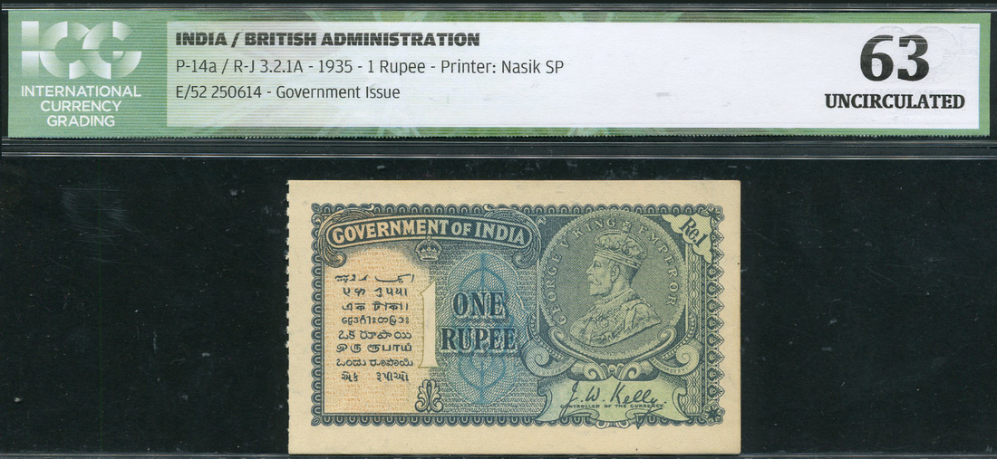 Government of India, 1 rupee (2), ND (1928-35), serial number 27A 972294, and E52 250614, green and blue, 1 rupee coin with George V portrait at right, Kelly signature, both varieties of watermark represented