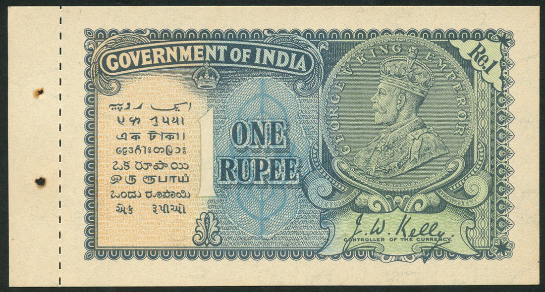 (x) Government of India, 1 rupee, 1935 (1940), serial number E/46 483238, blue, green and orange, 1 rupee coin with portrait of George V top right, J.W.Kelly signature, reverse black and white, with counterfoil