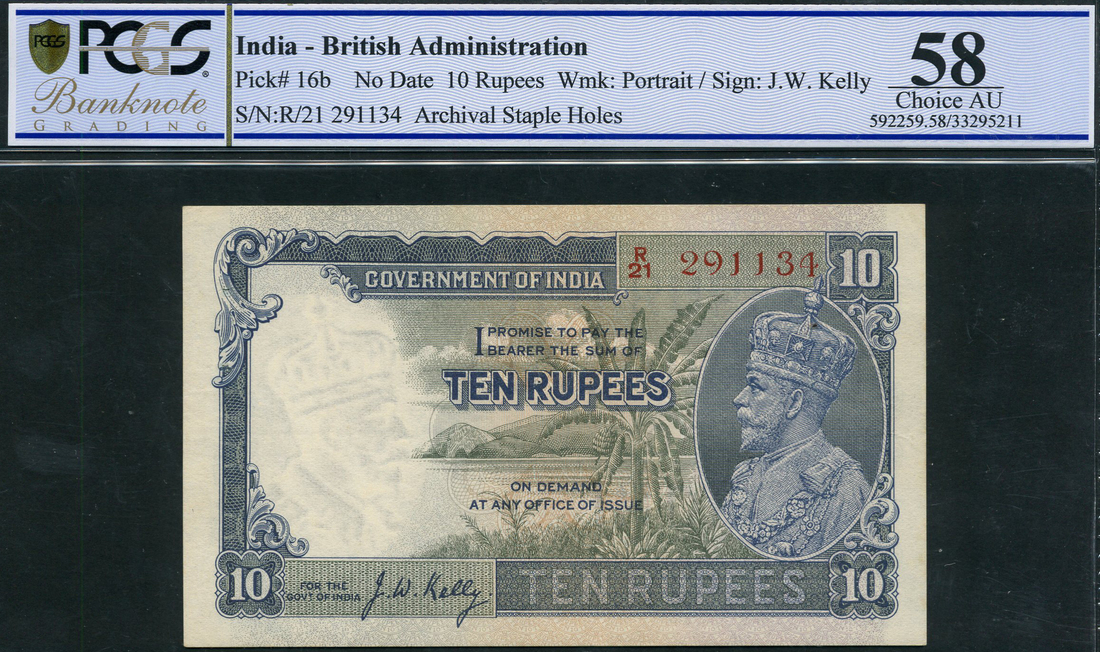 (x) Government of India, 10 rupees, ND (1935), red serial number R/21 291134, blue and white and green, crowned portrait of George V at right, Kelly signature