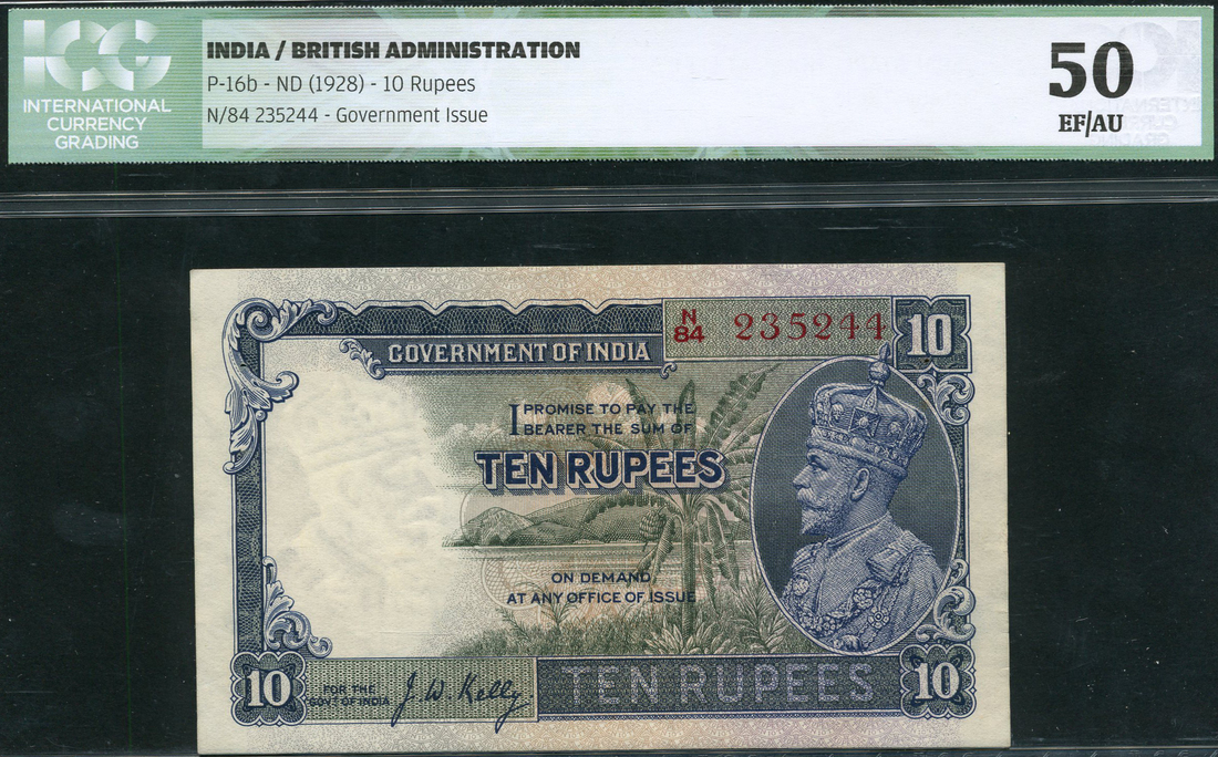 Government of India., 10 rupees, ND (1928-35), serial number N84 235244, brown, violet and pale brown, George V at right in oval frame, palm tree and lake at centre, Kelly signature