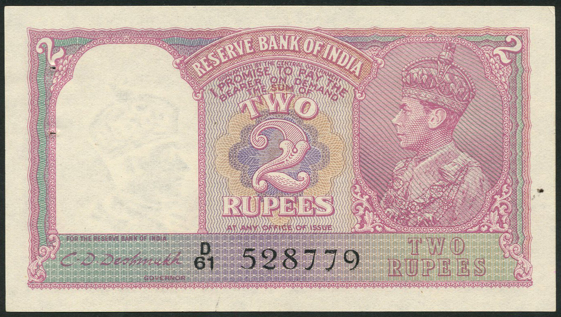Government of India, 2 rupees (3), 1937, black serial numbers D/61 528779-81, pink on multicolour underprint, George VI at right, value at centre and top left and right, Deshmukh signature