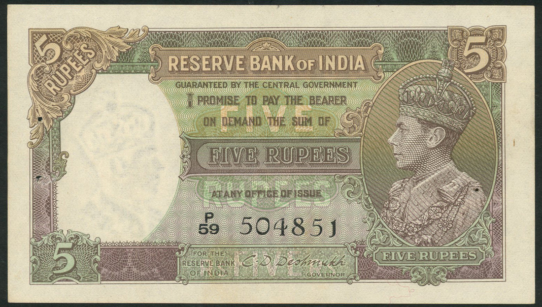 Reserve Bank of India, 5 rupees, ND (1943), serial number P59 504851, brown and green, crowned bust of George VI at right, Deshmukh signature