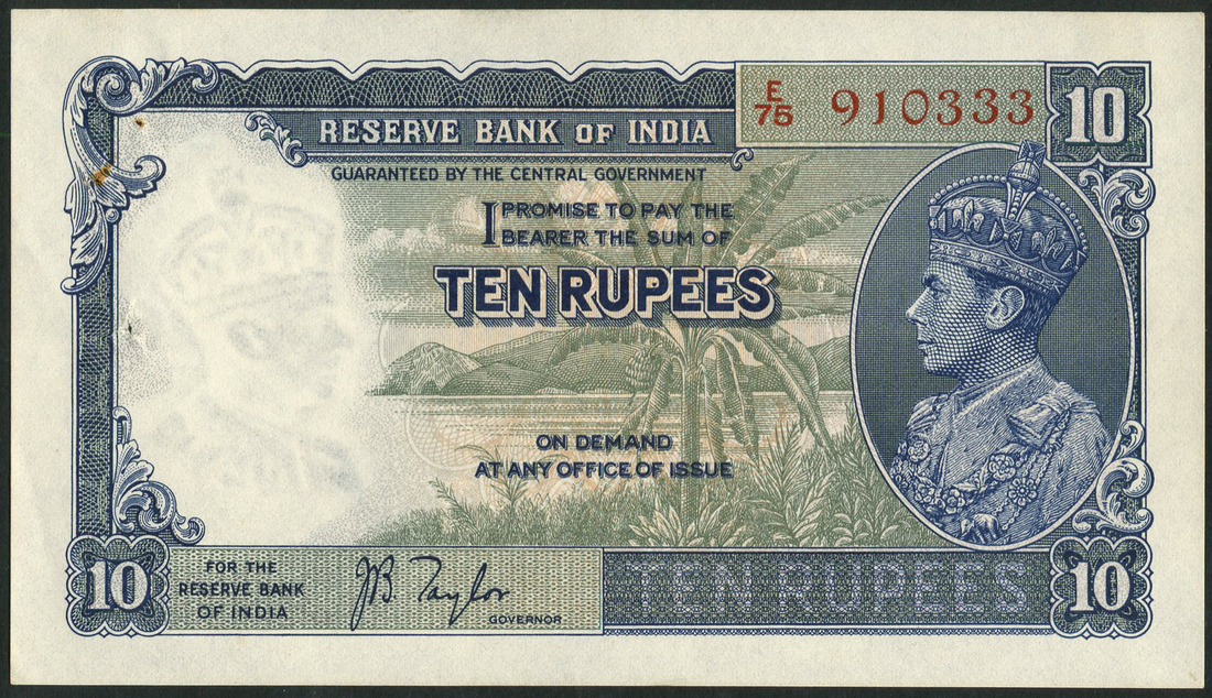 Reserve Bank of India, 5 rupees (2), ND (1938), prefixes D/69,K/41, purple and pale green, George VI at right, Taylor and Deshmukh signatures respectively, also 10 rupees (2), ND (1938), red prefixes E/75, H/55, D/69,K/41, blue and pale green, palm tree and George VI at right, Taylor and Deshmukh signatures respectively