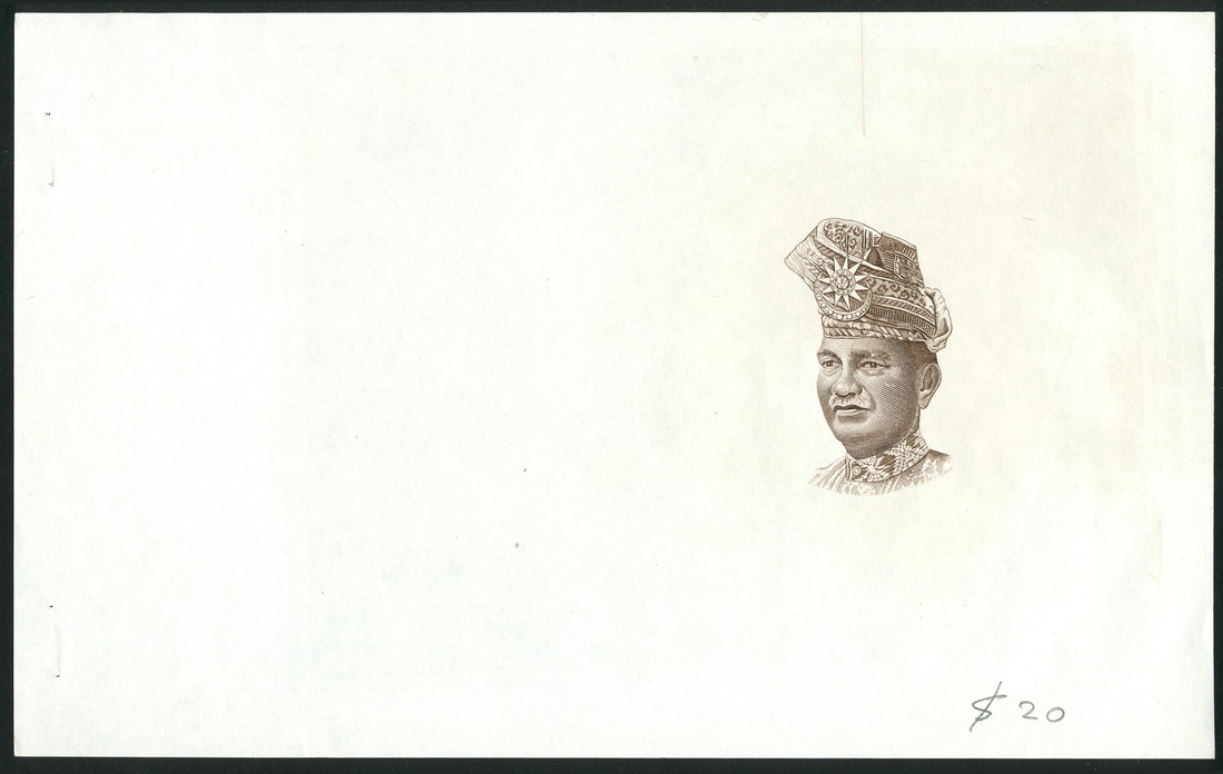 Malaysia, a die proof vignette of Tuanku Abdul Rahman wearing tengkolok headdress, brown print, used on the $20, 1967-2007