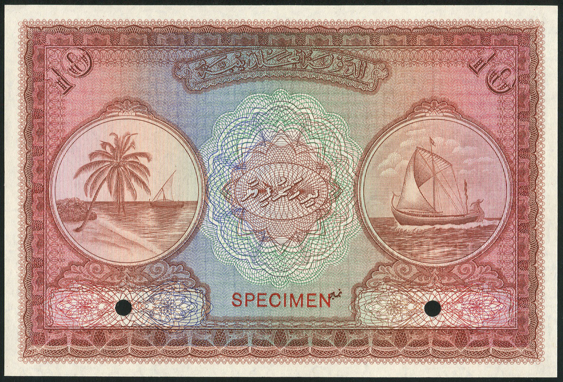 (†) Government of the Maldives, a group of specimens of the 1947 Issues comprising 1 Rufiyaa, blue and green; 2 Rufiyaa, brown and blue; 5 Rufiyaa, purple and violet; 10 Rufiyaa, ND, red-brown, green and blue, all palm tree and beach at left, dhow at right, all overprinted SPECIMEN horizontally in red on obverse and reverse, two punch holes