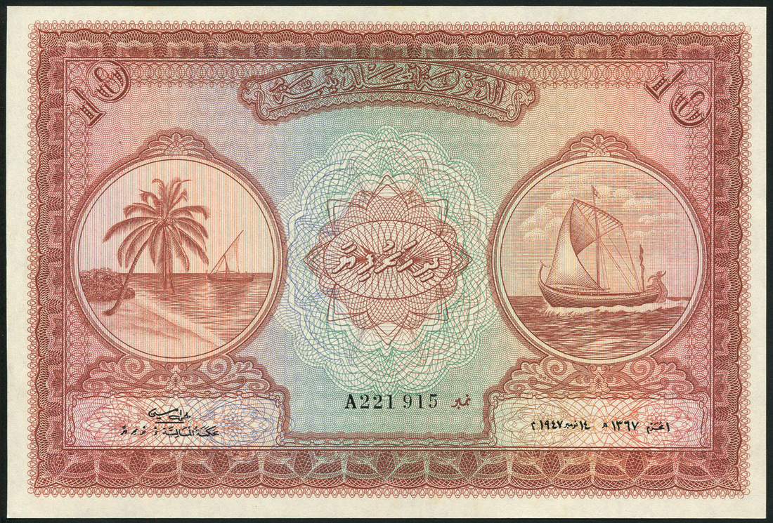 Government of the Maldives, 10 rufiyaa (2), 1947, serial numbers A 221915/221916, rd-brown and multicoloured, palm and mas dhoani at left, mas odi at right, Kilegefan signature low left, reverse mauve and green, Sakkaranyaa Gate at centre, value top left and right