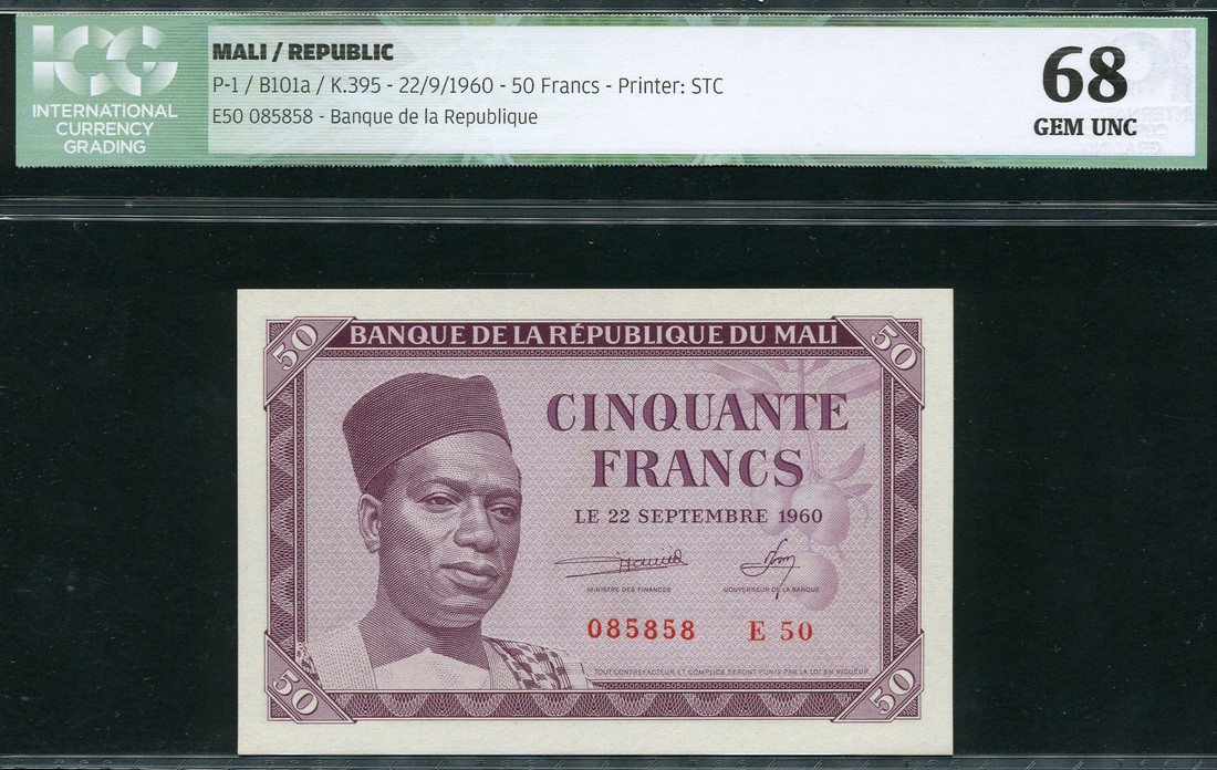 Banque de la Republique du Mali, 50, 100 francs, 1960, serial numbers E50 085858 and D41 714554, purple and brown respectively, Modibo Keita at left, Maiga and Sow signatures