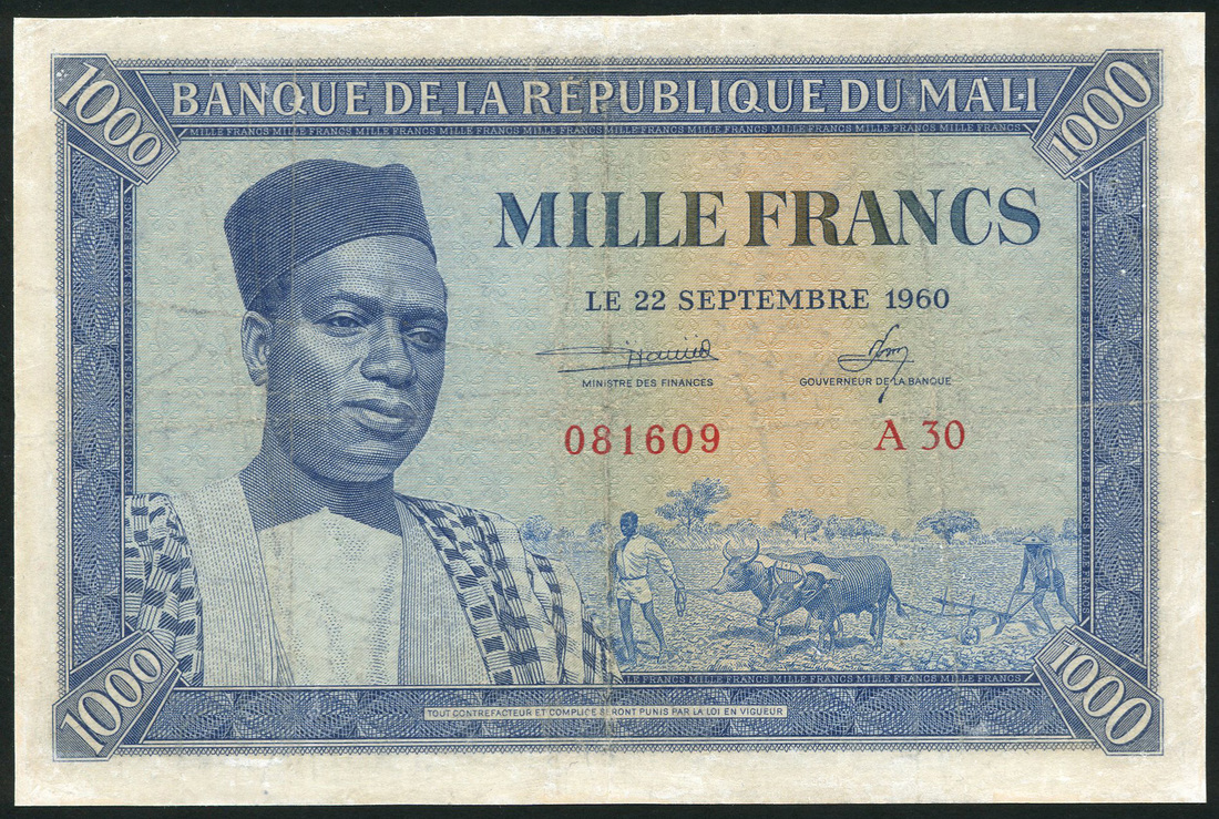 Banque de la Republique du Mali, 1000 francs, 22 September 1960, red serial number A30 081609, blue and pale orange, Modibo Keita at left, signatures of Maiga and Sow