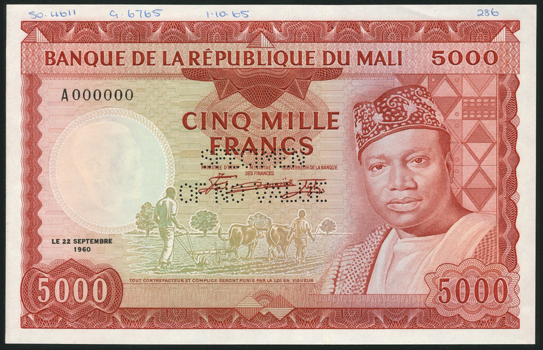 (†) Banque de la Republique du Mali, a full specimen set from the 1960 issue, 50 francs, purple, 100 francs, brown and 500 francs, green, 1000 francs, blue, 5000 francs, red, all with prefix A, no serial number, President Modibo Keita at right, perforated SPECIMEN