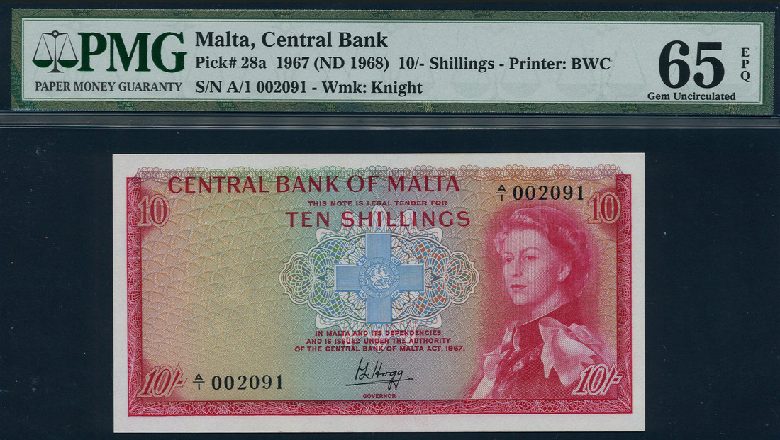 (x) Central Bank of Malta, 10 shillings, ND (1968), serial number A/1 002091, red and multicoloured, Elizabeth II at right, George Cross at centre, Hogg signature