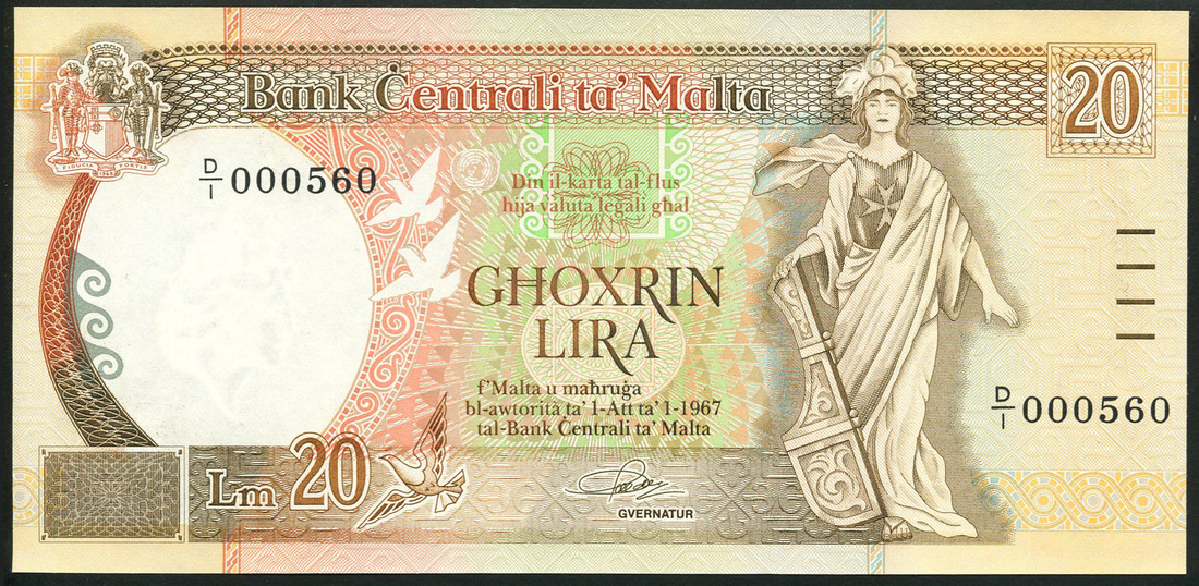 Central Bank of Malta, a full set from the 1967 (1989) issue, comprising 2 liri, prefix A/1, 5 liri, prefix B/1, 10 liri, prefix C/1 and 20 lira, prefix D/1, all with serial number 000560,