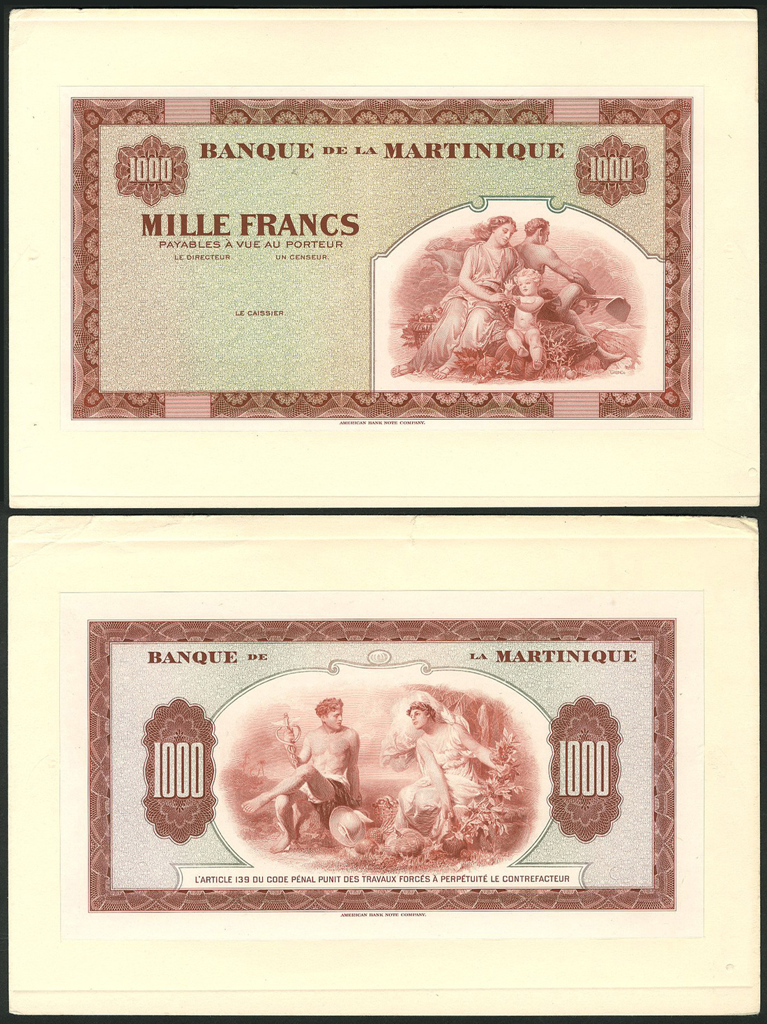 Banque de la Martinique, an obverse and reverse uniface proof for a 1000 francs, ND (1942), red-brown and green, allegorical family at right, reverse red-brown and pale blue-green, Mercury and Harvest at centre, value at left and right