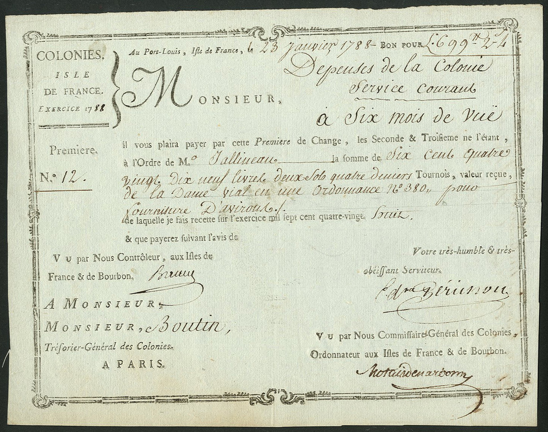 Isles de France et du Bourbon, Mauritius, a six month sight bill dated 23 January 1788, serial number 12, black text on pale blue parchment-like paper, for the amount of 699 livres,2 sols and 4 deniers