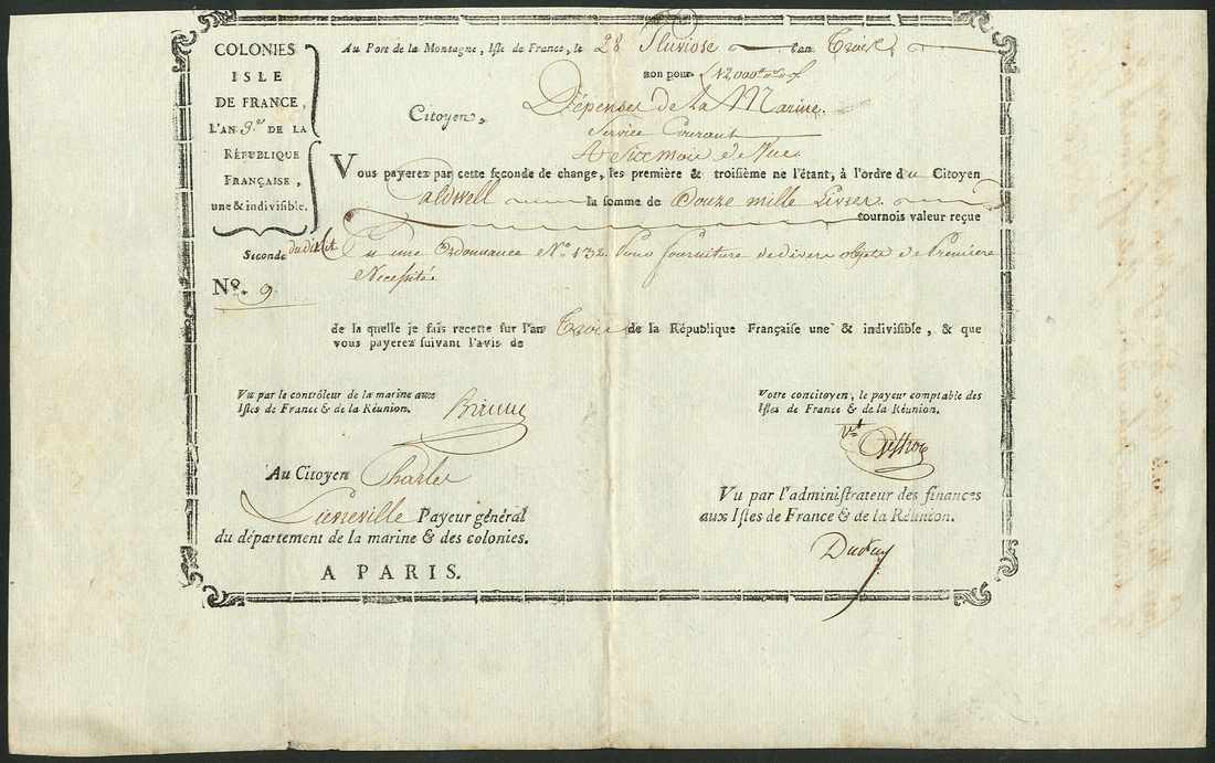 Isles de France et du Bourbon, Port de la Montagne, Mauritius, a six month sight bill dated 1795, serial number 9, black text on pale blue parchment-like paper, for the amount of 12000 livres,