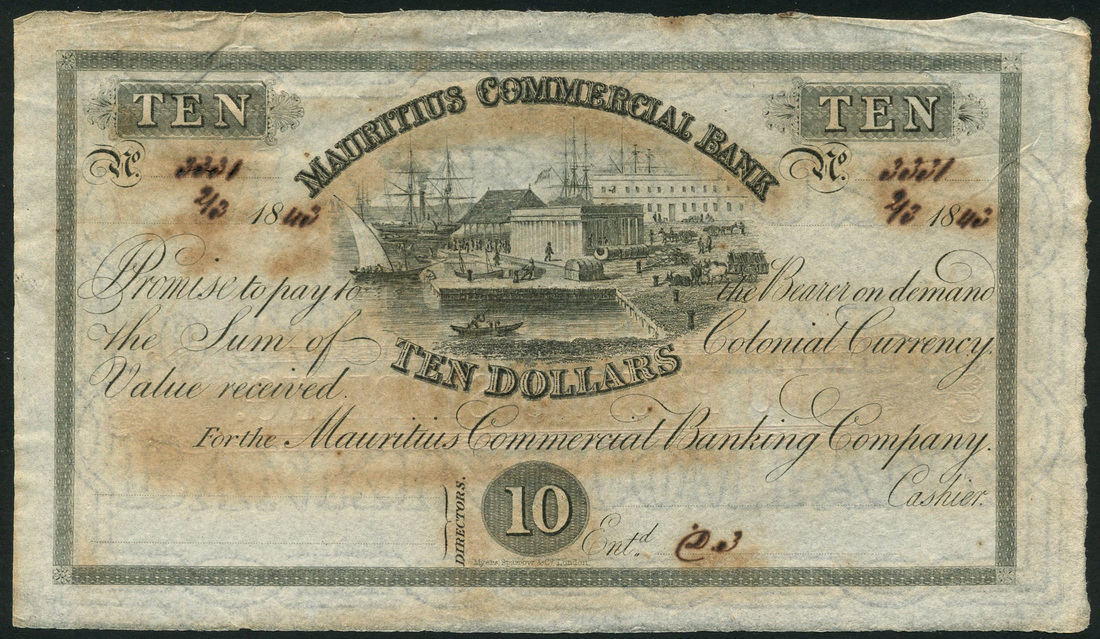 Mauritius Commercial Bank, $10, 1843, serial number 3331, black, waterfront scene top centre with bank title above, value top left, right and at centre, reverse red TWO POUNDS STERLING overprint