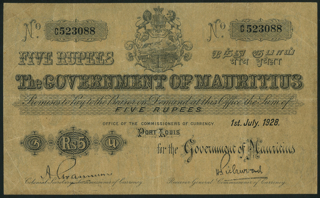 Government of Mauritius, 5 rupees, Port Louis, 1 July 1928, serial number C 523088, black text on olive-brown paper, arms top centre, printed signatures of Grannum and Pickwoad, value at centre and at left and right