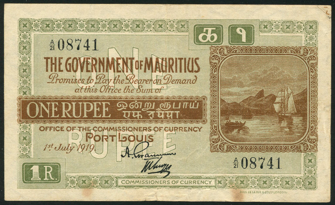 Government of Mauritius, 1 rupee, Port Louis, 1 July 1919, serial number A/21 08741, brown and green, ships and coastline in brown frame at right, , value in brown left centre