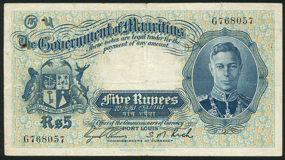 Government of Mauritius, 5 rupees, ND (1937), serial number G 768057, blue, white and salmon, George VI at right, arms at left, reverse blue text on white background