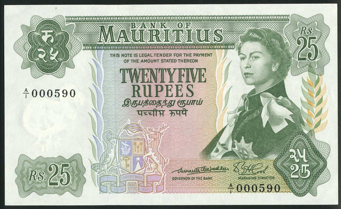 Bank of Mauritius, 5, 10, 25, 50 rupees, ND (1967), all serial number A/1 000590, blue, red, green and purple respectively, all portrait Queen Elizabeth II at right, bank title top centre, value in each corner and at centre, signatures of Beejadhur and Hook