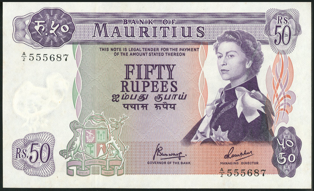 Bank of Mauritius, a group comprising 5 rupees, prefix A/43, blue, 10 rupees, prefix A/36, red, 25 rupees, prefix A/11, green and 50 rupees, prefix A/2, purple, all Elizabeth II at right