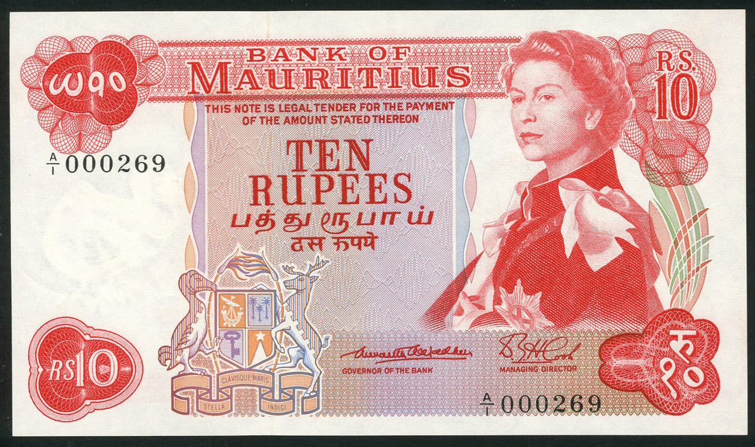 (x) Bank of Mauritius, 10 rupees, ND (1967), serial number A/1 000269, red, portrait Queen Elizabeth II at right, arms low centre left, reverse, government building, 1000 rupees, ND (1990), serial number AB660926, blue and multicolour, portrait First President Veerasamy Ringadoo at right, government building centre, arms low centre, reverse, aerial view of island