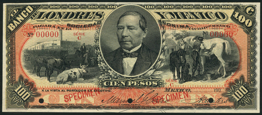 El Banco de Londres y Mexico, specimen/ proof 100 pesos, ND (190-), zero serial number, black on red and yellow, portrait of B. Juarez at centre, red SPECIMEN overprint, hold punched