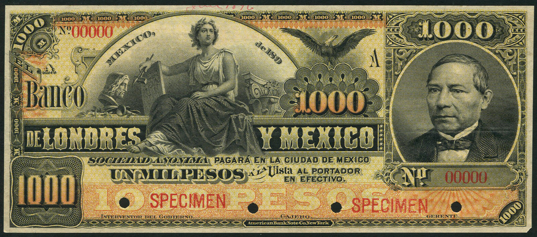 El Banco de Londres y Mexico, specimen/ proof 1000 pesos, ND (1899), zero serial number, black on orange and yellow, seated allegorical maiden at centre, portrait of B. Juarez at right, red SPECIMEN overprint, hold punched