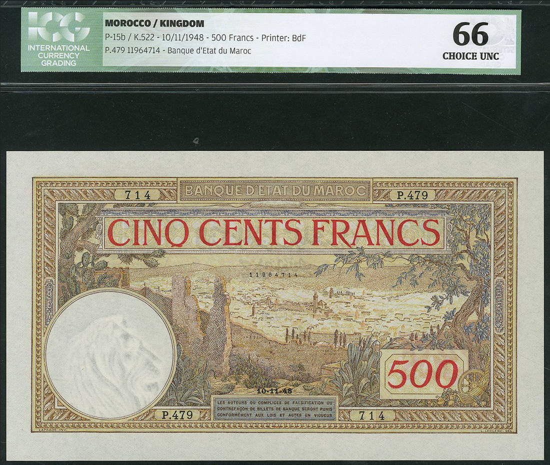Banque d'Etat du Maroc, 500 francs, 10 November 1948, serial number P479 714, brown, red and multicoloured, the city of Fez at centre