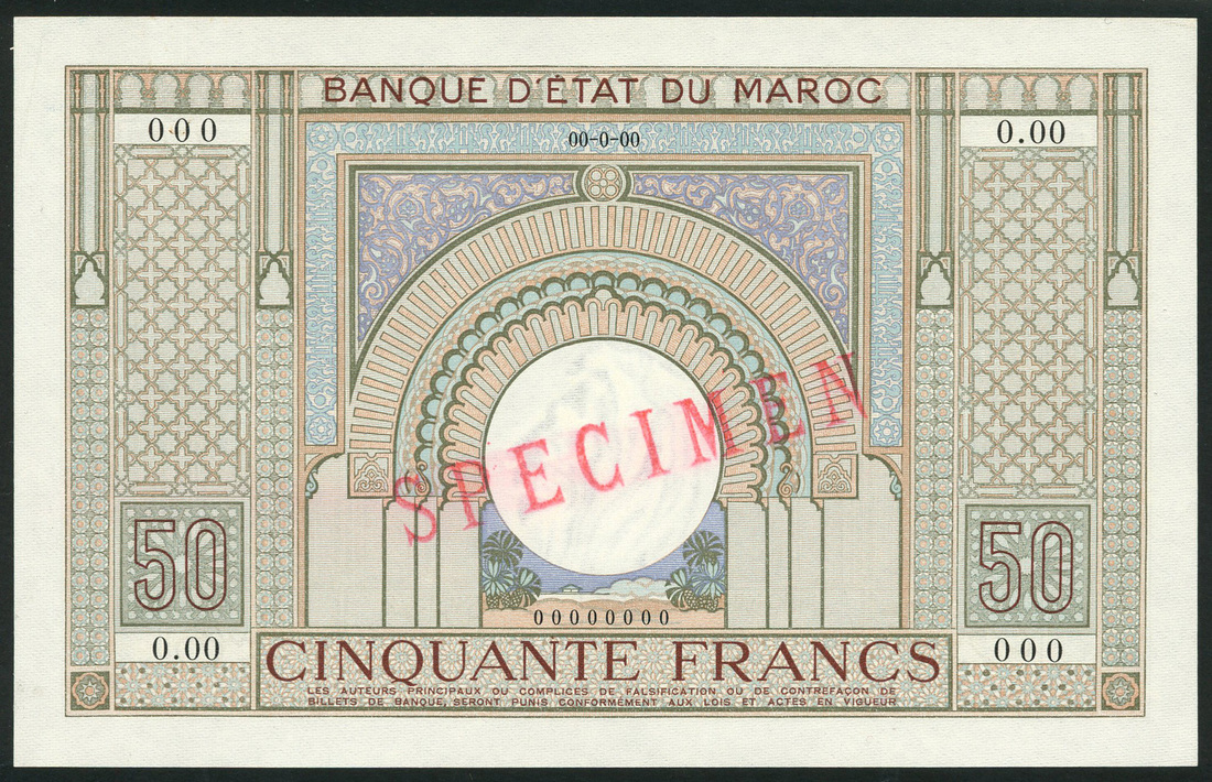 Banque d'Etat du Maroc, specimen 50 francs, ND (1936), zero serial number, blue, green and sepia, arch at centre, reverse Arabesque pattern