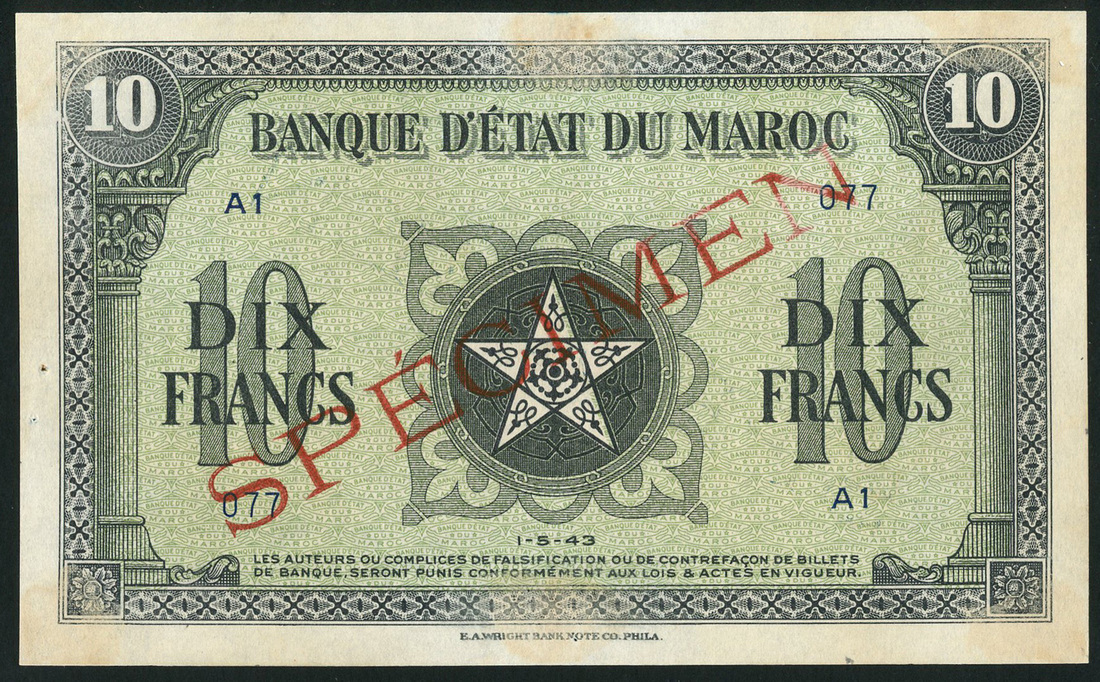 Banque d'Etat du Maroc, specimen 10 francs, 1943, serial number A1 077, black on green, five pointed star at centre flanked by denomination, reverse blue on red