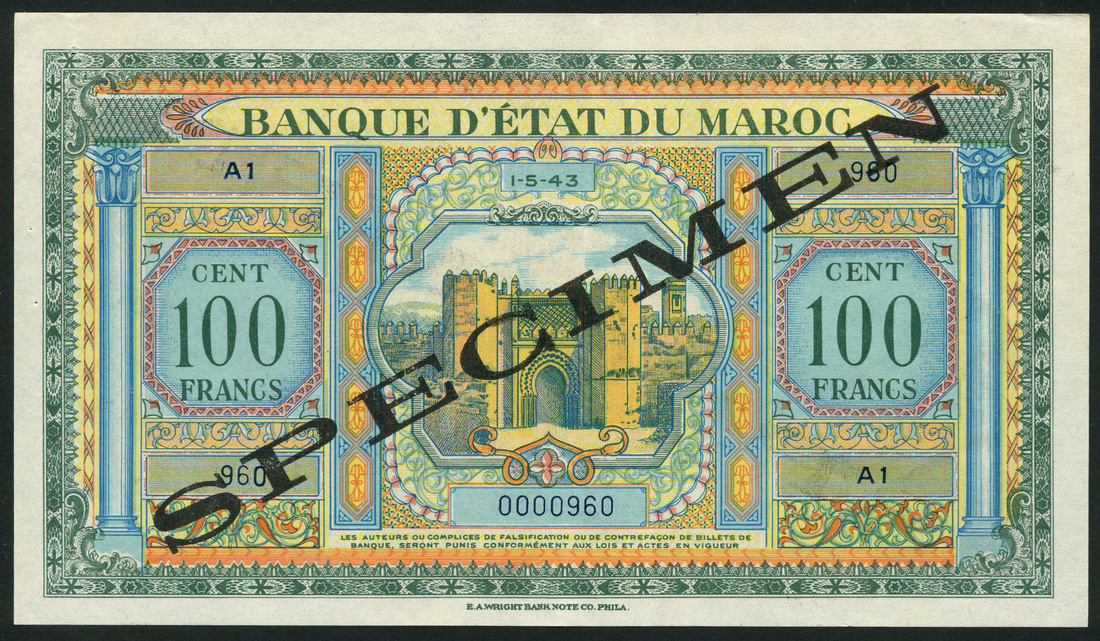 Banque d'Etat du Maroc, 100 francs, 1 May 1943, serial number A1 0000960, multicolour, gate in city wall at centre, black SPECIMEN overprint