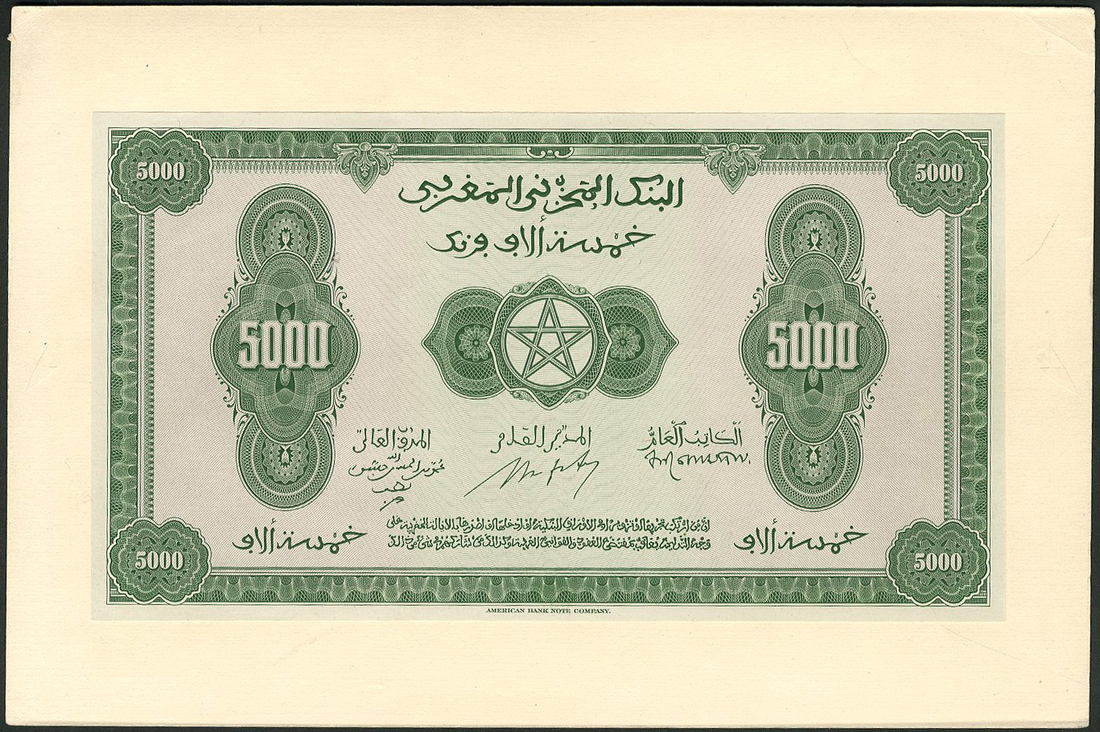 Banque d'Etat du Maroc, a uniface obverse and reverse proof on card for a 5000 francs, 1 August 1943, green and white