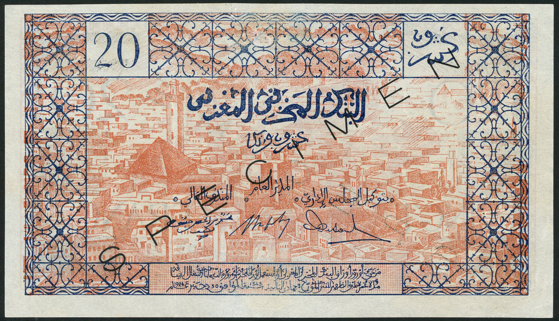 Banque d'Etat du Maroc, partially printed specimen 20 francs, ND (1943), no serial number, blue and red, view of building on a hillside at centre, obverse missing the name of bank, black SPECIMEN overprint