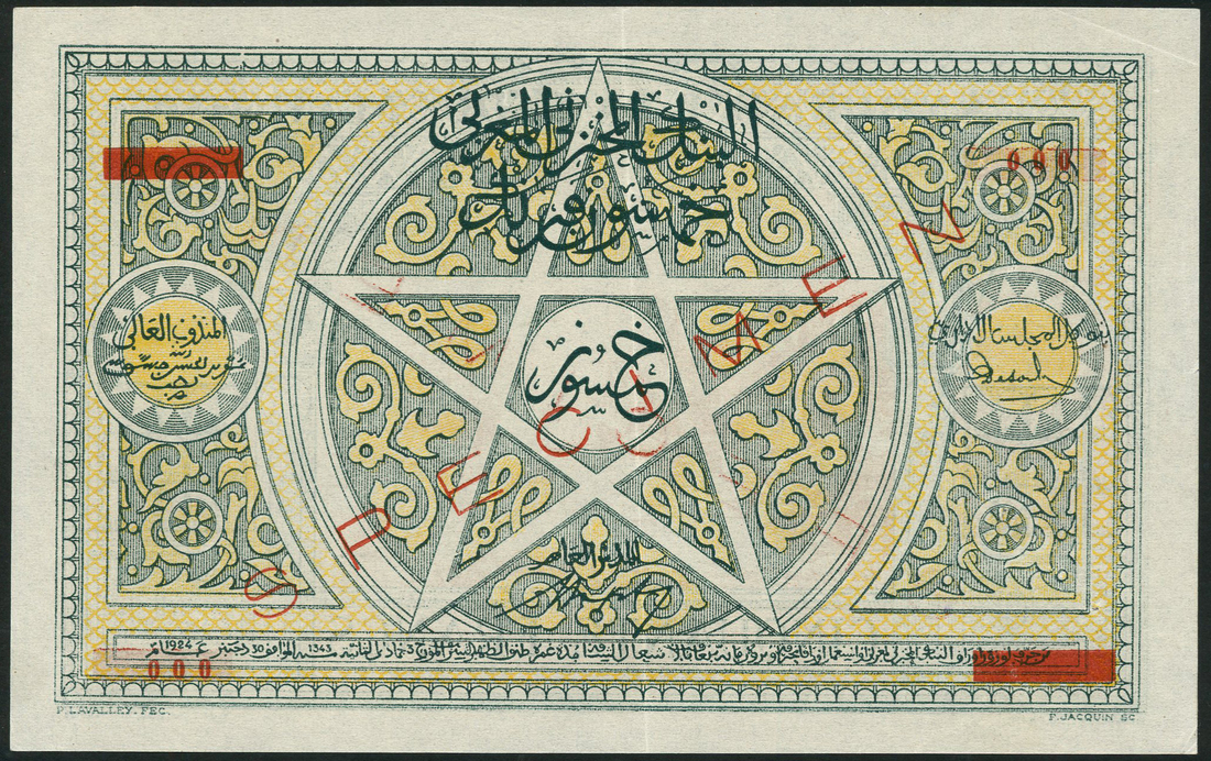 Banque d'Etat du Maroc, specimen 50 francs, ND (1943), serial number 000016, green on orange, Fortress and sailing ship at centre, reverse green and yellow, large five pointed star at centre, red specimen overprint