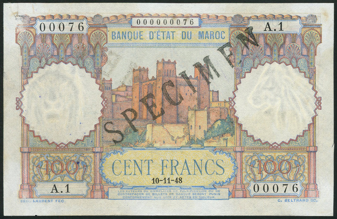 Banque d'Etat du Maroc, 100 francs, 1948, serial number A.1 00076, multicolour, fortress at centre, reverse, ornate pattern, black