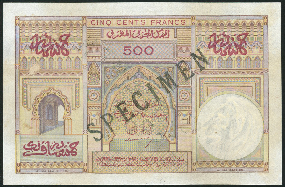 Banque d'Etat du Maroc specimen 500 francs, ND, serial number F.1 96062, multicoloured, doorway of house with Moroccan city in background, reverse multicoloured, arched doorway at centre, black SPECIMEN overprint,