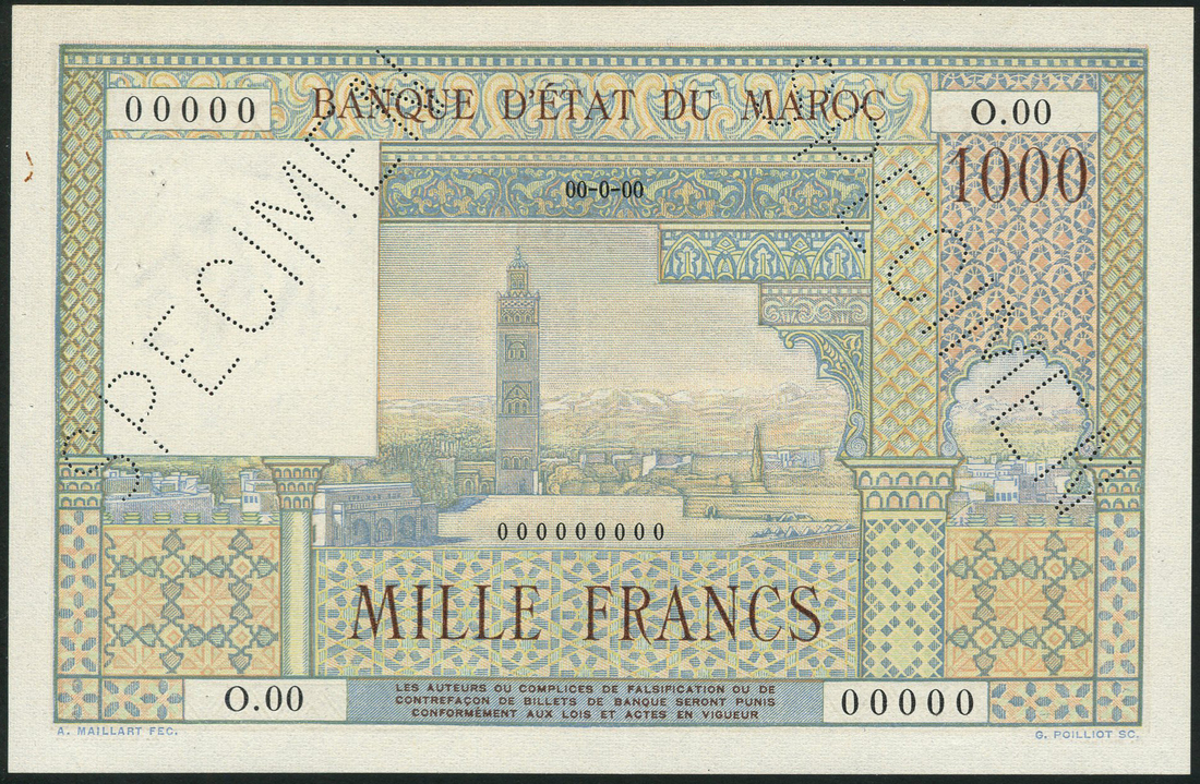 Banque d'Etat du Maroc, specimen 1000 francs, ND (1951), zero serial number, multicolour, minaret of the Koutoubia mosque in Marrakech, reverse buildings in Rabat, perforated SPECIMEN