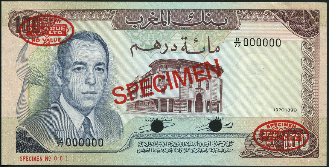(x) Banque de Maroc a group of specimens of the 1970 Issue, all King Hassan II at left, zero serial numbers, comprising 5 Dirhams, prefix AA/12, violet; 10 Dirhams, prefix BB/83, brown; 50 Dirhams, prefix C/46, green and brown; and 100 Dirhams, prefix D/77, brown, slate-violet and green, all overprinted SPECIMEN in red with two De La Rue specimen ovals on obverse and reverse, two punch holes
