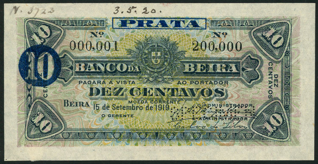 (†) Banco da Beira, Mozambique, printers archival specimen 10 centavos, 15 September 1919, serial number range 000,001-200,000, dark green, yellow and blue, arms at centre, value at each corner and overprinted in blue at left, reverse purple, perforated SPECIMEN