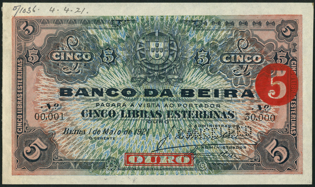 (†) Banco da Beira, Mozambique, 5 libras, 1 February 1921, serial number range 0001-10000, dark grey on multicolour underprint, arms at top centre, value at corners, and overprinted in red at right, reverse dark grey, value at centre, small CANCELLED perforation