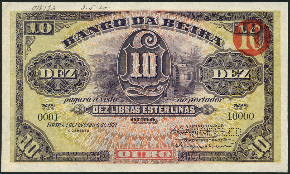 (†) Banco da Beira, Mozambique, 10 libras, 1 February 1921, serial number range 0001-10000, purple on multicolour underprint, value at centre, left and right and each corner, and overprinted in red at top right, reverse blue, arms at top centre, small CANCELLED perforation