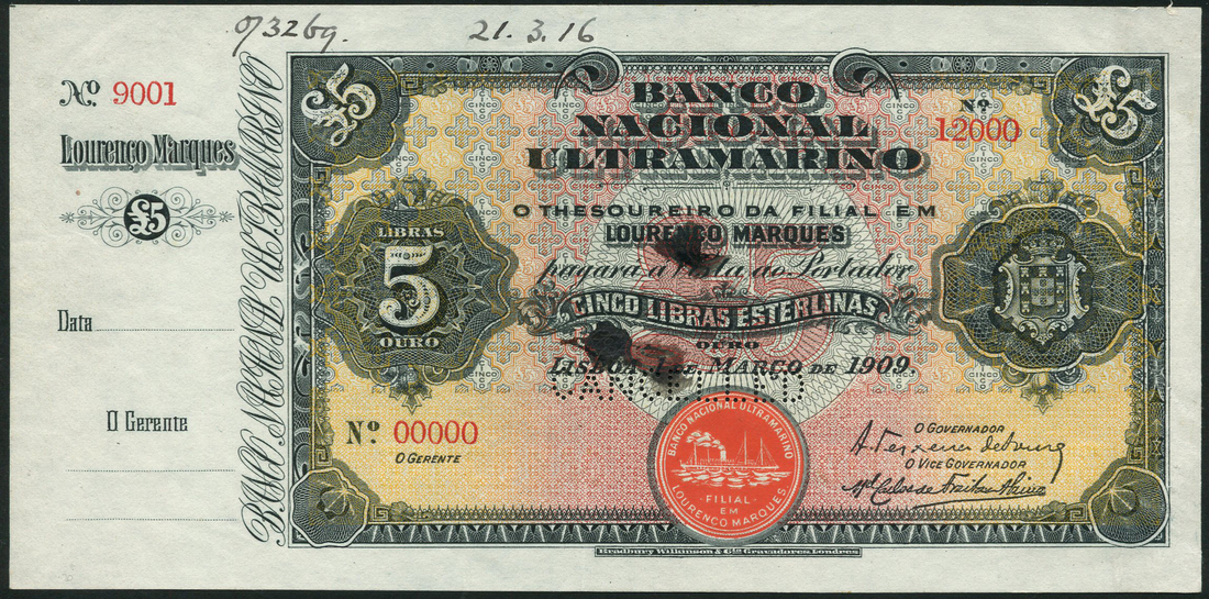 (†) Banco Nacional Ultramarino, Mozambique, printer's archival specimen 5 Libras Esterlinas, with counterfoil, Lisbon, 1 March 1909, serial number run 9001 to 12000, black on pink, blue and yellow underprint, arms at right, value in guilloche at left, red steamship seal Type I at lower centre, reverse, green, pale blue and yellow, value in ornate guilloche, perforated CANCELLED