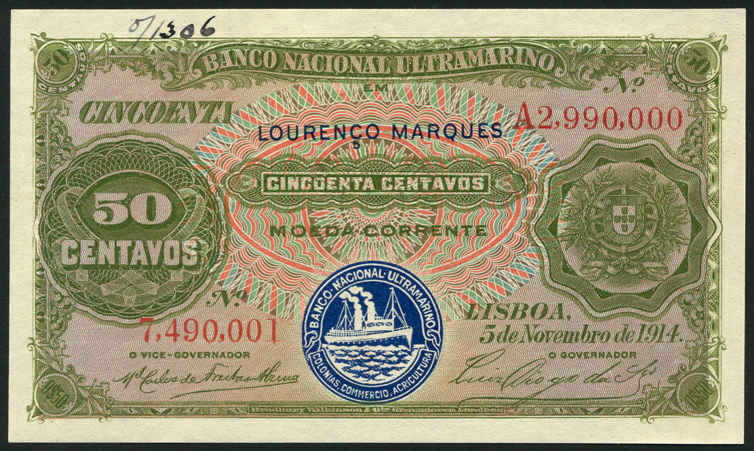 (†) Banco Nacional Ultramarino, Mozambique, a set of printer's archival specimens, 5 November 1914, comprising 10 Centavos, serial run 6,000,001 to 6,500,000, purple and green; 20 Centavos, serial run 9,990,001 to A4,490,000, blue; 50 Centavos, serial run 7,490,001 to A2,990,000, green, all value at left, arms at right, green, red and blue overprint LOURENCO MARQUES respectively at upper centre, steamship seal Type III at lower centre, all reverse allegorical woman looking out at sailing ships