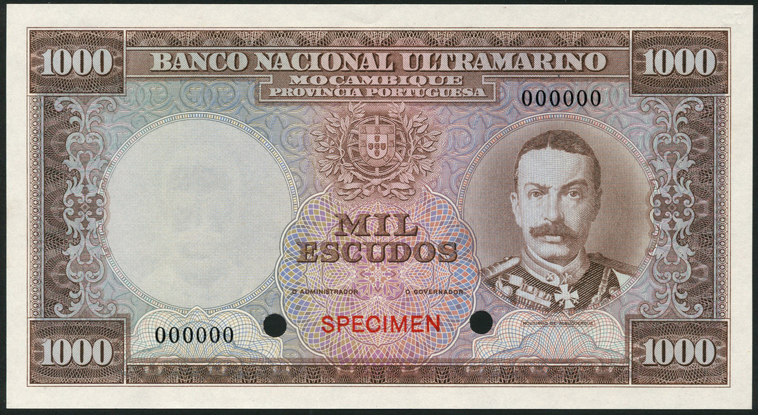 (†) Banco Nacional Ultramarino, Mozambique, specimen colour trial 1000 Escudos (2), ND (ca 1953), serial number 000000, no signatures, brown on pink and blue-grey underprint, portrait of Mousinho de Albuquerque at right, reverse coat of arms at centre, bank seal at left, overprinted SPECIMEN in red on obverse, specimen numbers 51 and 52 in black in reverse top left corner, two punch holes