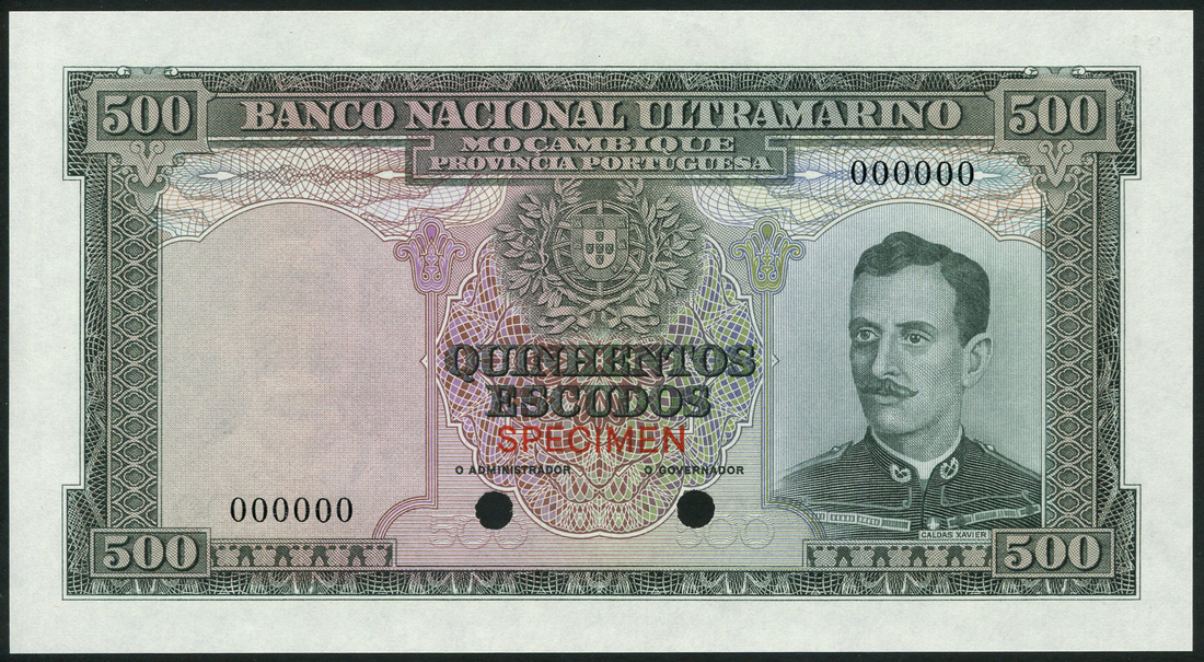 (†) Banco Nacional Ultramarino, Mozambique, specimen colour trial 100 Escudos, ND (ca 1961), serial number C 0000000, no signatures, without Decreto Lei; specimen colour trial 100 Escudos, 27 March 1961, serial number C 0000000, signatures Francisco Jose Vieira Machado and Antonio Julip de Castro Fernandes, with Decreto Lei, both purple, Aires de Ornelas at right; also specimen colour trial 500 Escudos, ND (ca 1958), serial number 000000, no signatures, deep green, Caldas Xavier at right, reverse arms, all overprinted SPECIMEN in red, two punch holes