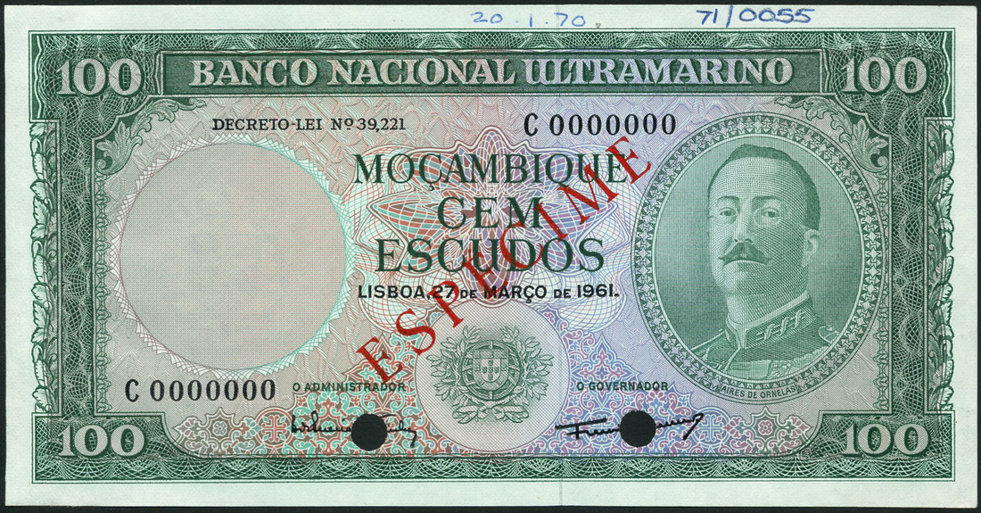 (†) Banco Nacional Ultramarino, Mozambique, specimen 100 Escudos (3), 27 March 1961, serial number C 0000000, three different Administrador signatures of Abel Beja Corte Real, Luis Pereira Coutinho and Antonio J. de C. Fernandes respectively, green, Aires de Ornelas at right, overprinted ESPECIME in red; also specimen 50 Escudos (2), 27 October 1970, serial numbers 0000000 and B0000000 respectively, black, green and pink, Joao de Azevado Coutinho at left, both overprinted SPECIMEN in red with two De La Rue specimen ovals on obverse and reverse, all two punch holes