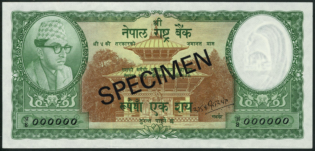 (†) Nepal Rastra Bank, a group of specimens comprising 1 rupee, 1960, pink on olive green, 5 rupees, 1960, purple on teal, 10 rupees, 1960, grey on pink, all with Himalaya Shumsher J.B. Rana signature and perforated CANCELLED, 100 rupees, 1965, green on brown, Yadav Prasad Pant signature