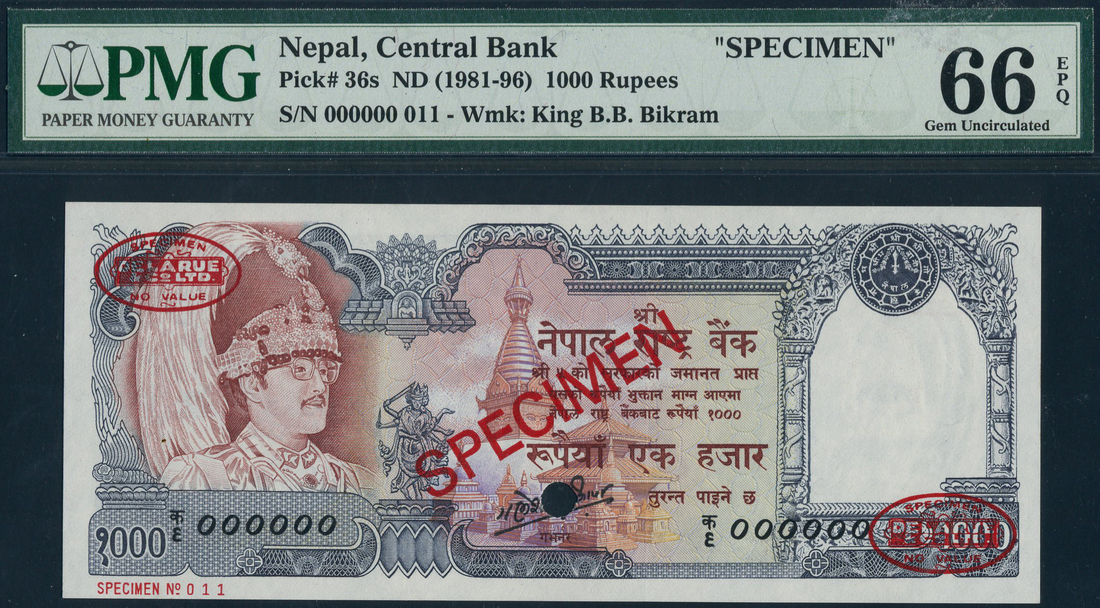 (x) Central Bank, Nepal, specimen 1000 rupees, ND (1981-86), serial number 000000 011, blue on multicolour underprint, King Birendra at left, temple of goddess Harati at centre, reverse, elephant at centre, bank logo and coat of arms at left